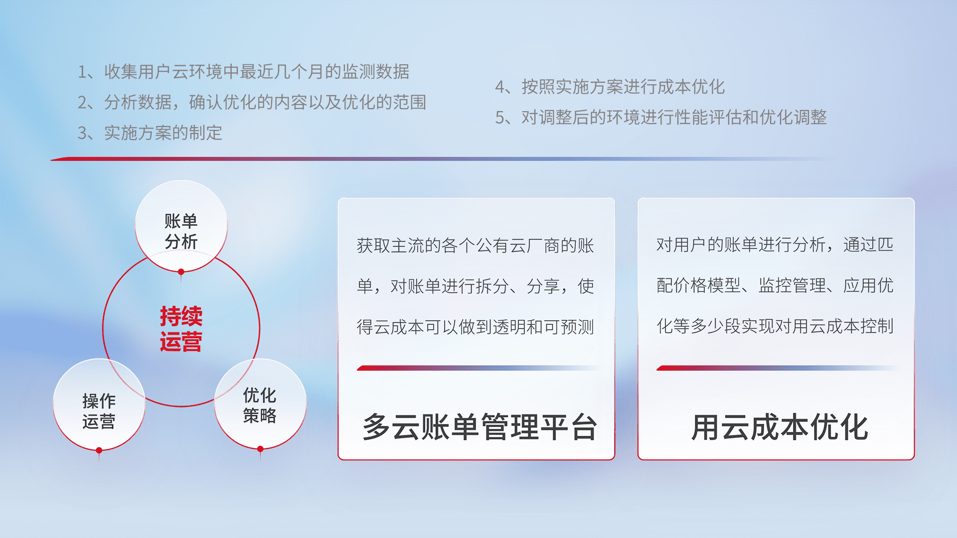 通过多云纳管,,以统一的资源数据模型把客户的云资源进行抽象和封装,,,,进而实现对多云资源的统一操作,,,,保障云资源管理的可靠性、、稳定性与可用性。。。量身定制化运维内容,,,配置、、、、开发运维、、、补丁管理、、、备份、、、监控、、认证和访问管理、、审计和日常巡检等,,,保障在用云过程中的可靠度,,稳定度以及高可用率。。。