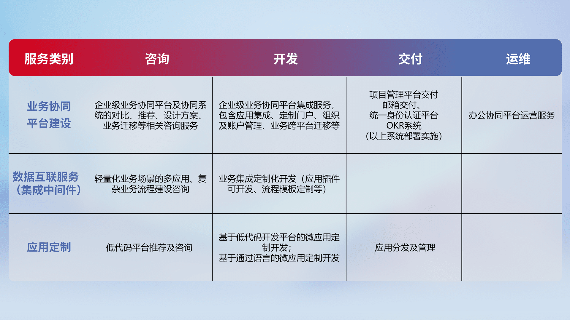 针对钉钉、、、、企微、、、、IDaas等平台级产品提供产品的规划、、方案、、交付、、、、定制化开发等服务,,实现如统一协同办公、、智能客户服务、、混合会议管理、、、智能数据查询、、、等业务场景,,实现数字化转型。。。